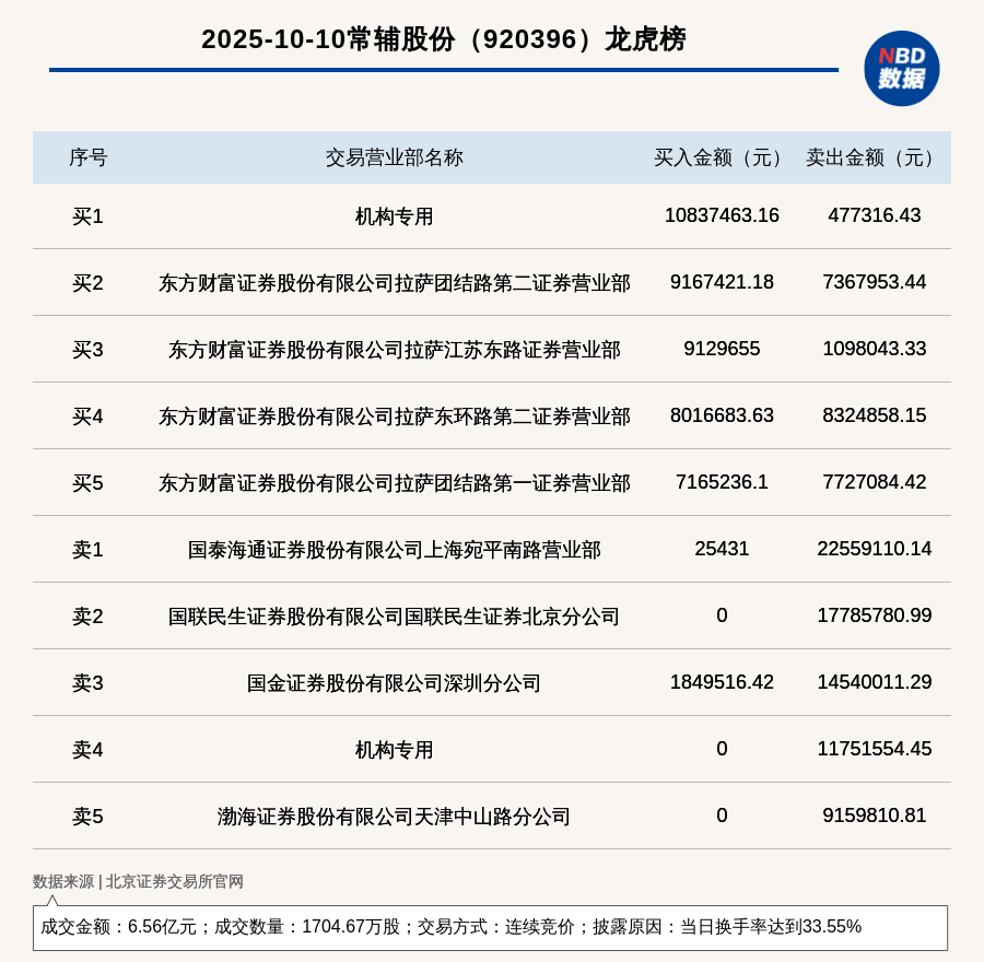 每經(jīng)訊,2025年10月10日,北交所上市公司常輔股份(920396,收盤價:37.2元)登上龍虎榜,交易方式是連續(xù)競價,披露原因是當日換手率達到33.55%,成交數(shù)量1704.67萬股,成交金額6.56億元。買一席位為機構(gòu)專用,買入1083.75萬元;賣一席位為國泰海通證券股份有限公司上海宛平南路營業(yè)部,賣出2255.91萬元。