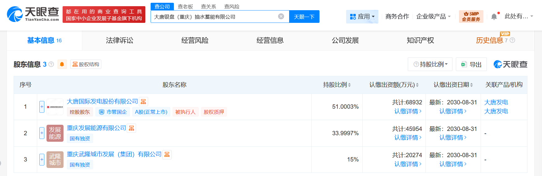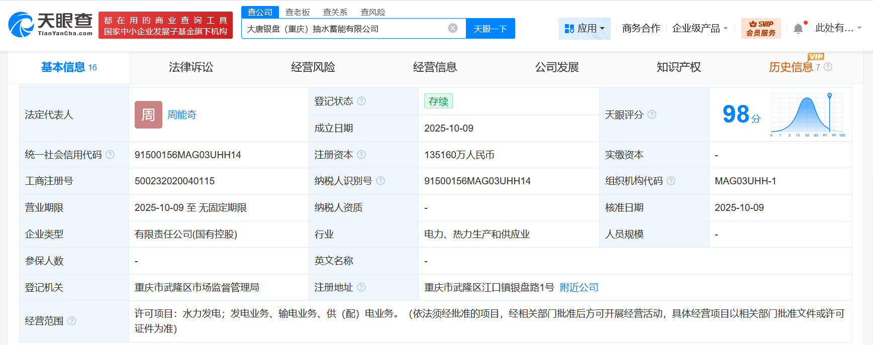 每經(jīng)AI快訊,天眼查工商信息顯示,近日,大唐銀盤(重慶)抽水蓄能有限公司成立,法定代表人為周能奇,注冊(cè)資本約13.5億元人民幣,經(jīng)營(yíng)范圍為水力發(fā)電,發(fā)電業(yè)務(wù)、輸電業(yè)務(wù)、供(配)電業(yè)務(wù)。股東信息顯示,該公司由大唐發(fā)電(601991)、重慶發(fā)展能源有限公司、重慶武隆城市發(fā)展(集團(tuán))有限公司共同持股。