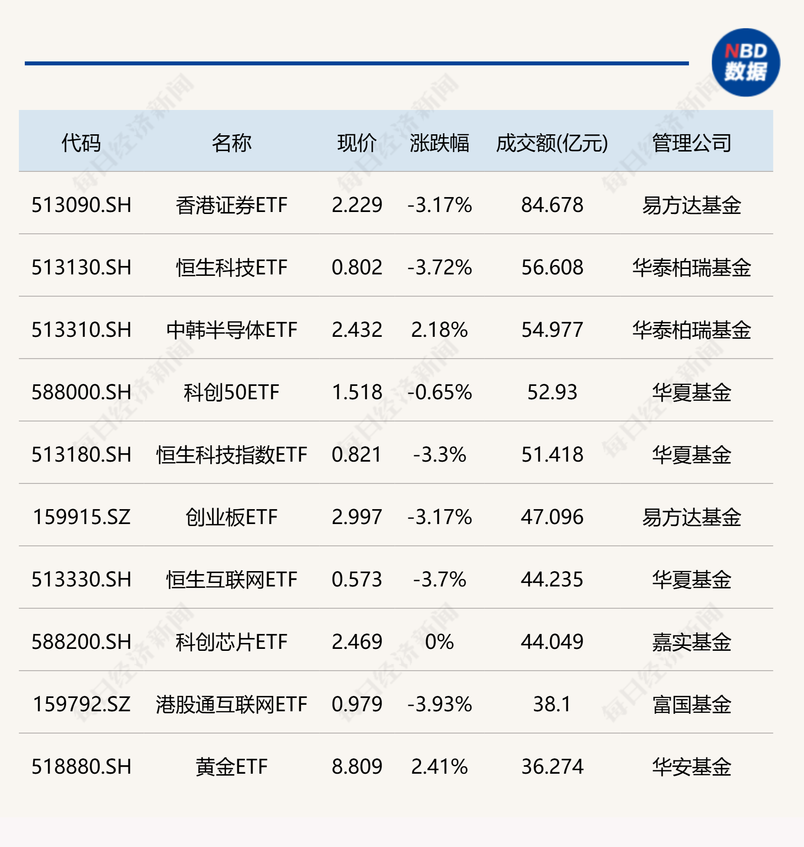 市場早盤震蕩回升,三大指數(shù)跌幅收窄。香港證券ETF半日成交84.68億元,交投活躍。此外,中韓半導(dǎo)體ETF、科創(chuàng)50ETF以及2只恒生科技相關(guān)ETF早盤成交額突破50億元。