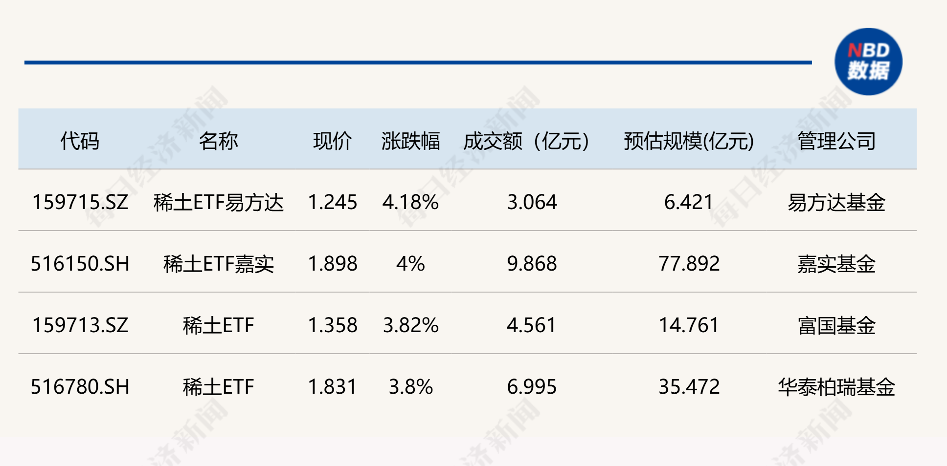 ETF漲幅榜上,稀土概念股早盤表現(xiàn)突出,稀土ETF易方達(159715)、稀土ETF嘉實(516150)上午漲幅達4%,另外2只稀土ETF半日漲幅均超過3%。