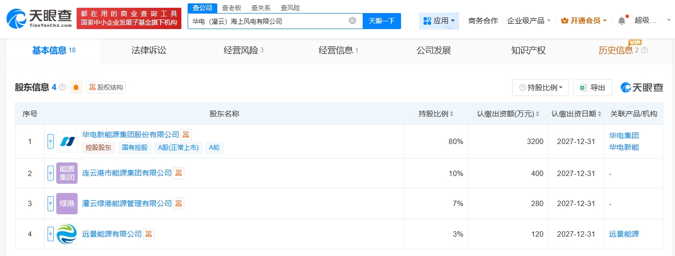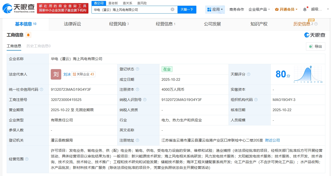 每經(jīng)AI快訊,天眼查App顯示,近日,華電(灌云)海上風(fēng)電有限公司成立,法定代表人為劉冰,注冊(cè)資本4000萬(wàn)元,經(jīng)營(yíng)范圍包括新興能源技術(shù)研發(fā)、海上風(fēng)電相關(guān)系統(tǒng)研發(fā)、風(fēng)力發(fā)電技術(shù)服務(wù)、太陽(yáng)能發(fā)電技術(shù)服務(wù)等。股東信息顯示,該公司由華電新能、遠(yuǎn)景能源有限公司等共同持股。