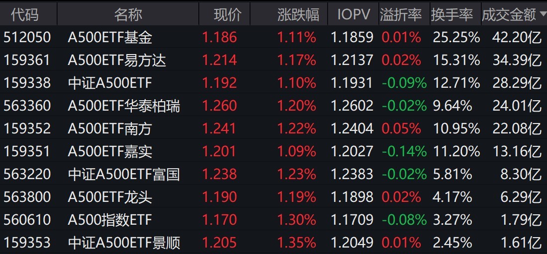 截至上午收盤,場內(nèi)跟蹤中證A500指數(shù)的ETF漲超1%。其中,有10只中證A500相關(guān)ETF成交額超1億元,3只超28億元。A500ETF基金、A500ETF易方達(dá)、中證A500ETF早盤成交額分別為42.2億元、34.39億元、28.29億元。