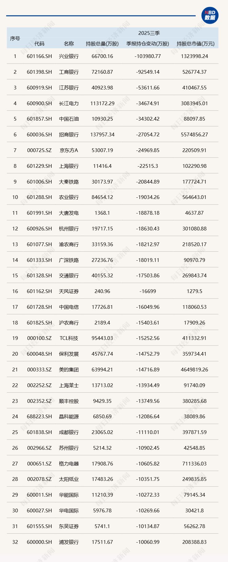 在A股方面,基金減倉超過1億股的個股達(dá)到32只,主要集中在金融板塊,多只銀行個股的持倉量明顯下降,而從股價表現(xiàn)來看,部分個股三季度也處于持續(xù)回調(diào)的狀態(tài)。