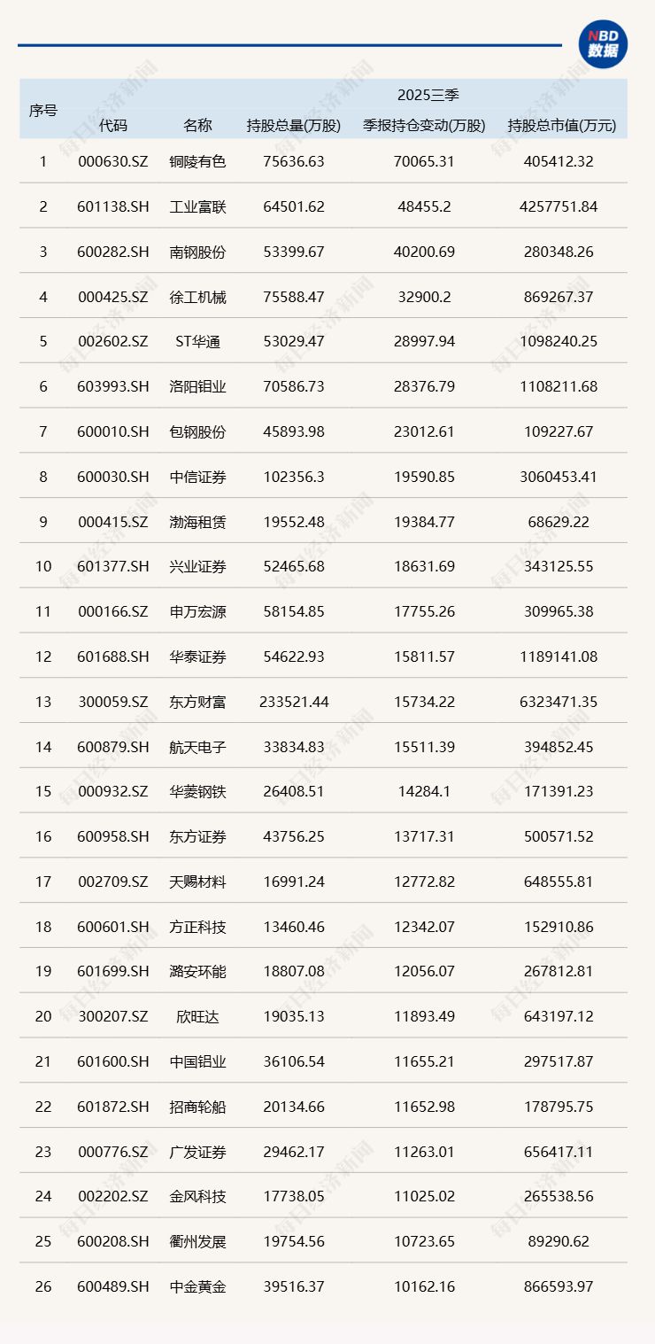 再接著來看基金三季度的整體加倉情況,A股方面,共有26只個股獲得基金超過1億股的增倉,其中三季度漲幅超過200%的工業(yè)富聯(lián),三季度基金的持倉數(shù)增加超過了4.8億股,持倉總數(shù)達(dá)到6.45億股,回看二季度末時,基金累計持倉還只有1.6億股。